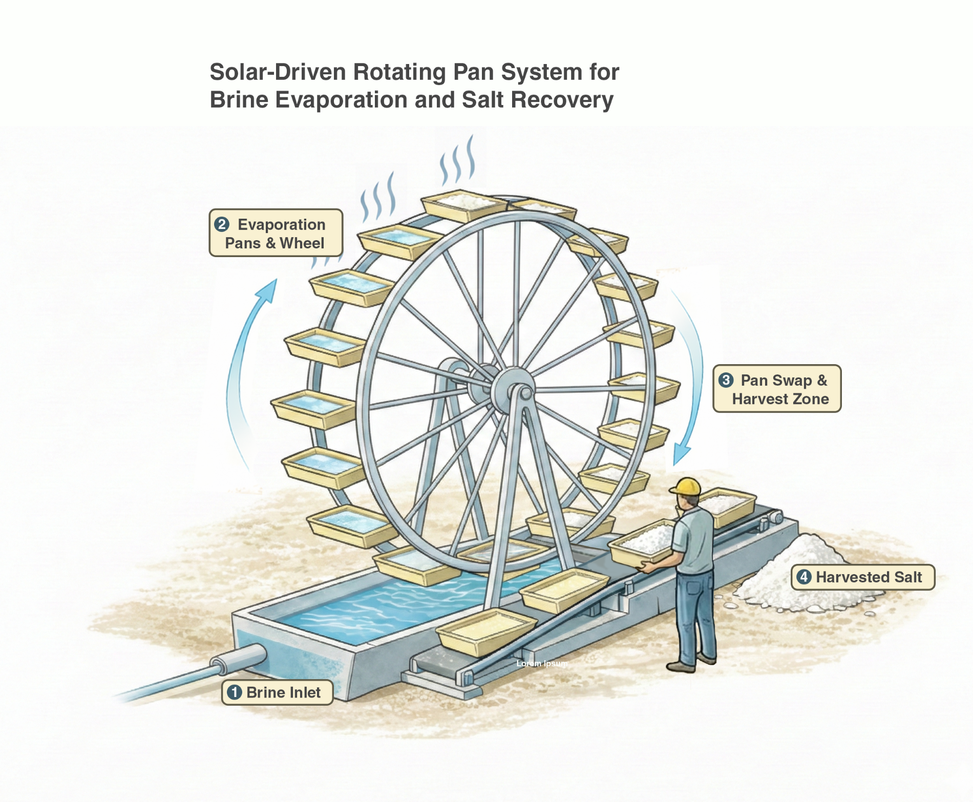 The pans of salt, if they are not completely dried out, could be inserted into other Ferris wheels outside of the potable water producing tents to complete the drying out process. The pans could be made tippable (not shown in the graphics) so that the maintainers could scrape the residue of the pans into truck beds of electric trucks or into containers on conveyor belt to be taken to areas for processing into table salt or road salts or any other types of salt that industry and communities might use now or in the future.